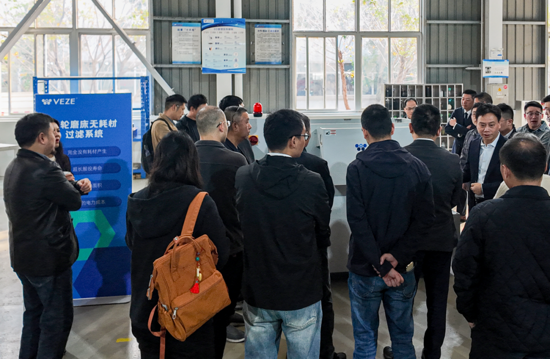 随后,嘉宾们前往生产车间,开启实地参观环节。本次开放日重点展示了齿轮珩磨过滤系统、齿轮磨床无耗材过滤系统、切削液无耗材过滤系统三款核心产品,每个展机区域均配备专业技术接待人员,从产品结构、运行原理到实际应用场景,进行了细致讲解。 参观过程中,嘉宾们围绕产品的节能性、维护成本等实际需求,与接待人员热烈交流,直观感受到产品的工艺精度与性能优势,现场互动氛围浓厚。